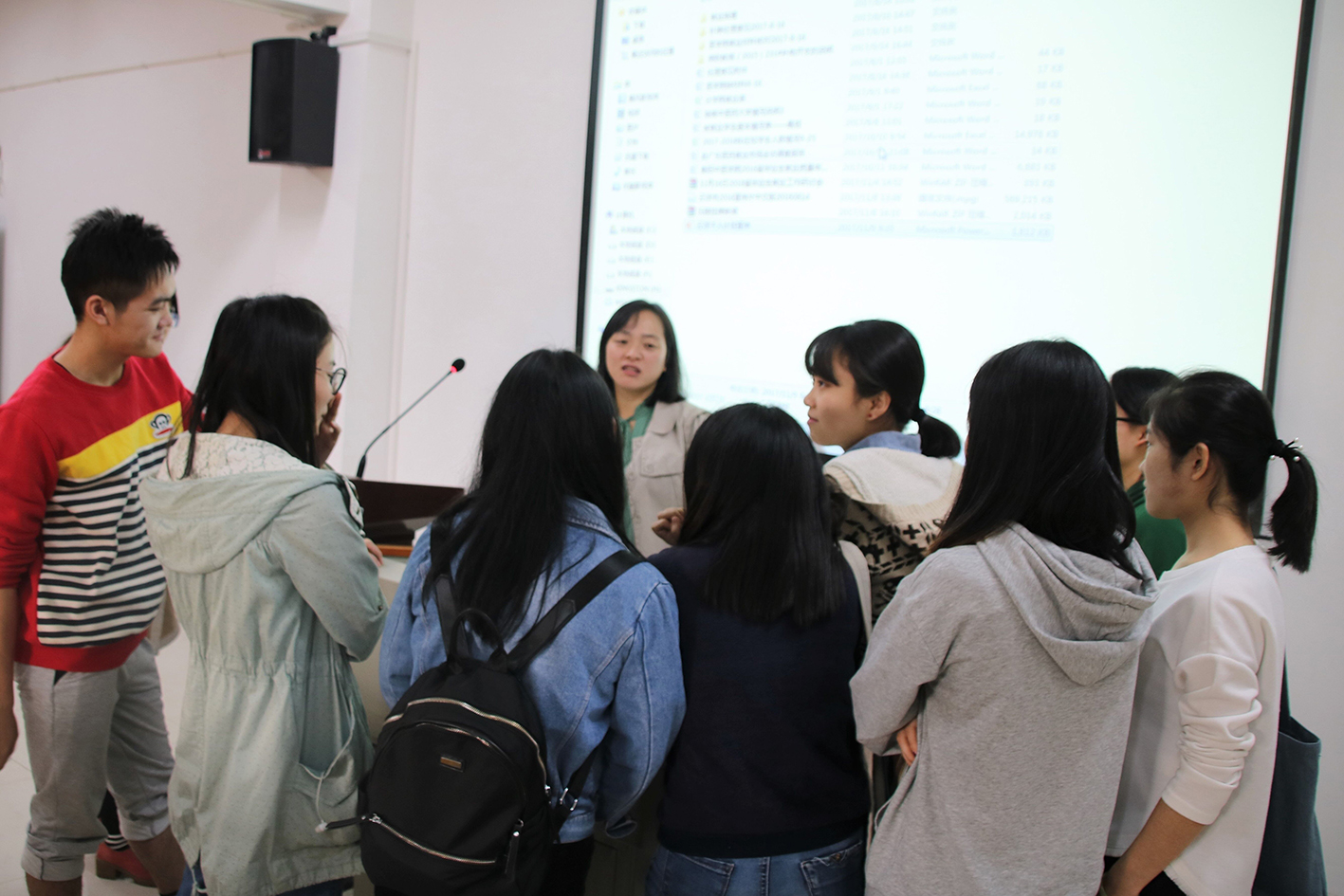 宣讲开始前,吴湘老师通过播放相关视频给同学们介绍了云浮市。视频内容包括云浮市的区位空间优势以及交通、生态、特色产业优势,让同学们更好地了解这个城市。然后吴老师对广东省云浮市2018年医疗卫生类相关政策进行介绍,包括签订“三方协议”到岗后发放生活补贴;享受市、县人民医院同类人员同等工资福利;每年不少于两个月的提升培训,五年服务期后可自由选择等。通过这个计划招聘的人才可享受人才补贴、直接入编“规培”、并被提供保障性住房。接着吴老师说明了此次招聘是面对应届全日制本科毕业生且获得学士学位以上的临床、中医学、检验、口腔、麻醉、护理等相关专业人才开设的。宣讲期间,吴老师也向我们展示了她在招聘单位新兴县人民医院考察以及在那里入职的学生的照片。会后,许多同学向吴老师询问了相关问题,展现了他们对此次医疗卫生类招聘的浓厚兴趣。