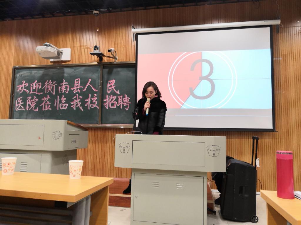 12月24日,湖南中医药大学医学院“衡南县人民医院招聘会专场”在二号办公楼一楼多媒体室成功召开。本次招聘会由医务部部长陈玉璇主讲,医学院党委书记文红艳,学生管理科老师,衡南县人民医院院长、副院长、各科室负责人以及部分2014级应聘学生共同参加此次招聘会。