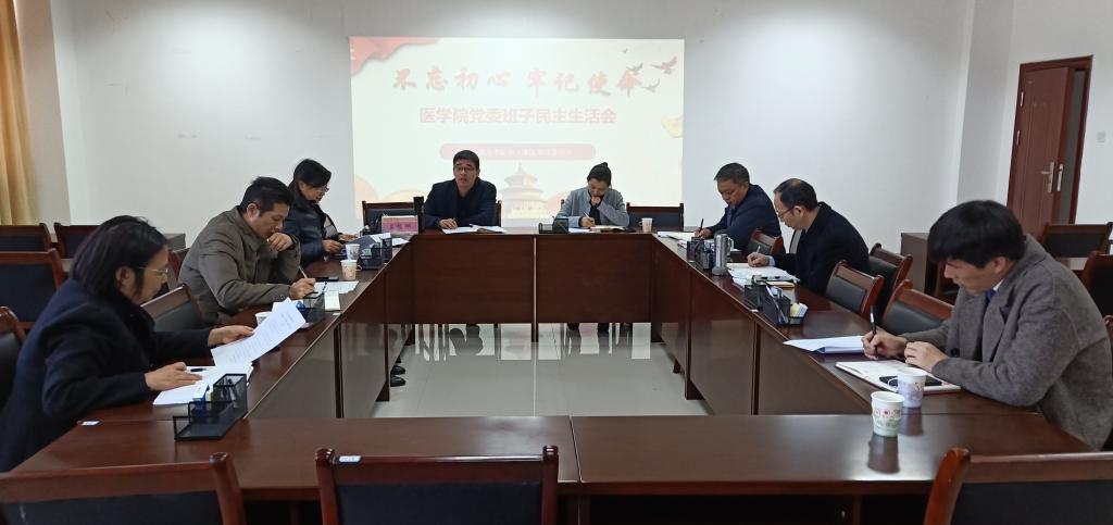 12月3日上午,医学院领导班子2019年度“不忘初心、牢记使命”专题民主生活会在学院会议室召开,大学党委委员副校长姜怡邓主持会议并讲话,校主题办主任银洁及医学院党委全体委员及党代表参加会议。