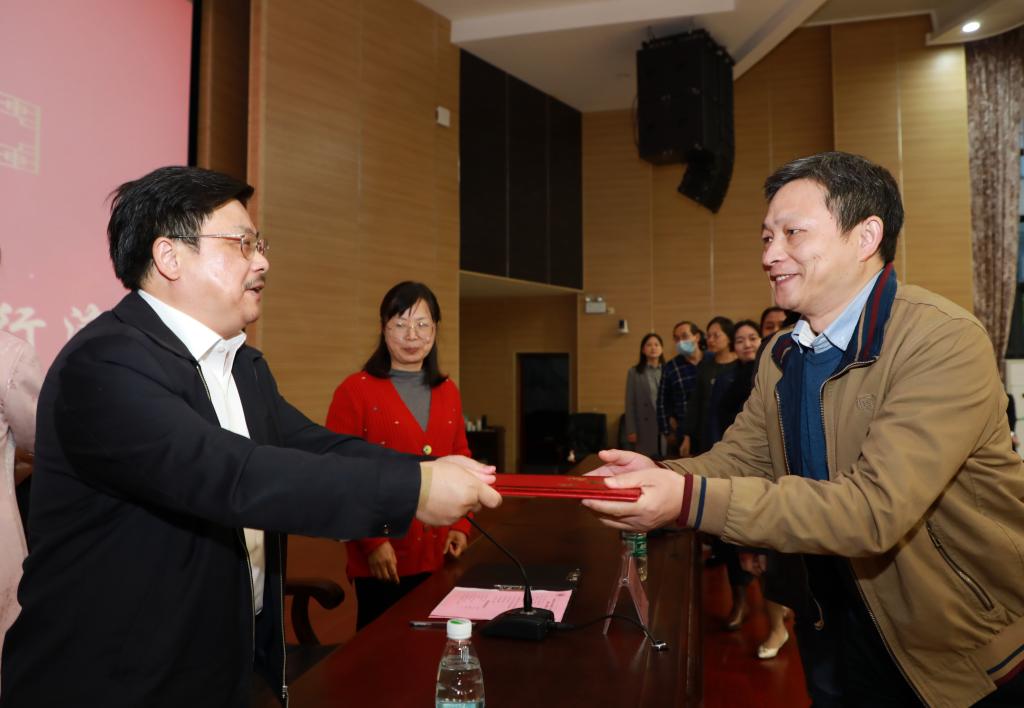 会后,庹勤慧宣布2021级新生班主任名单,戴爱国为2021级班主任颁发聘书。