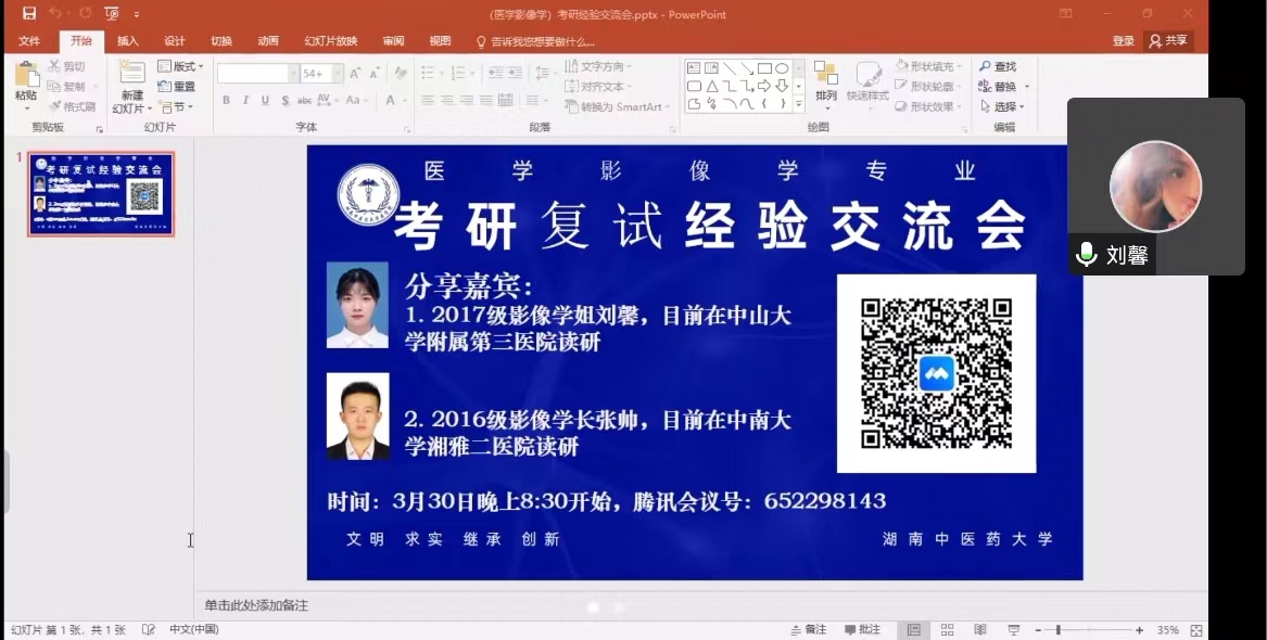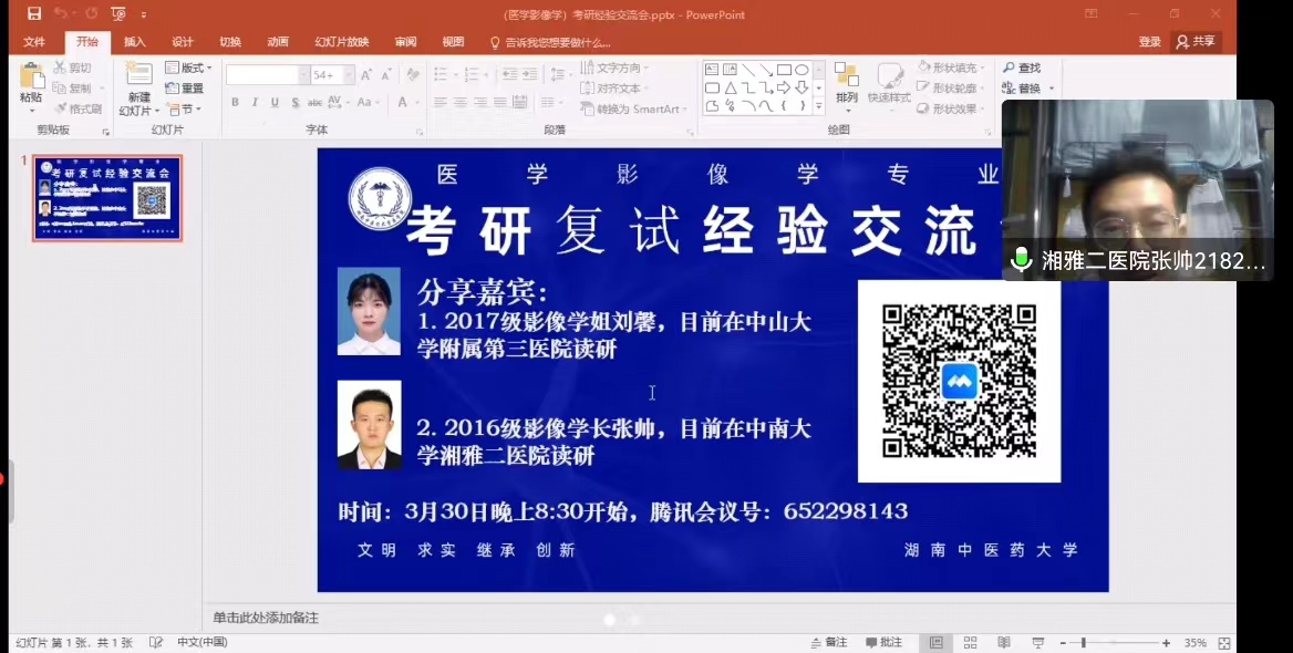 3月30日晚上8点,医学影像学专业考研复试经验交流会在线上召开。此次会议由李轶哲老师主持,受邀嘉宾有17级医学影像校优刘馨,16级医学影像校友张帅。