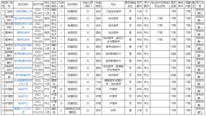 因医院发展和工作需要,现面向社会招聘工作人员,具体岗位、人数、要求等如下表!本次招聘劳务派遣岗位104人,包括专技岗位96人,管理岗位1人,辅助工勤岗位7人。岗位用工形式为劳务派遣。