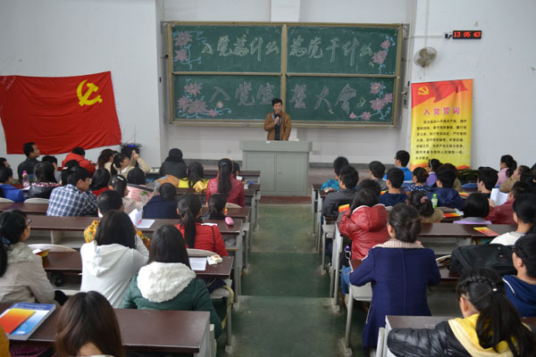 大会开始,2011级优秀党员代表王阳阳致词,围绕“入党为什么,入党干什么”主题进行深入分析,让党员就该做榜样,党员讲该为同学服务的观点深入人心。2012级新党员代表莫舒蕾发表了讲话并带领新党员进行宣誓。接着老党员陈浪也汇报了自己作为党员应该带头的不足与领悟。