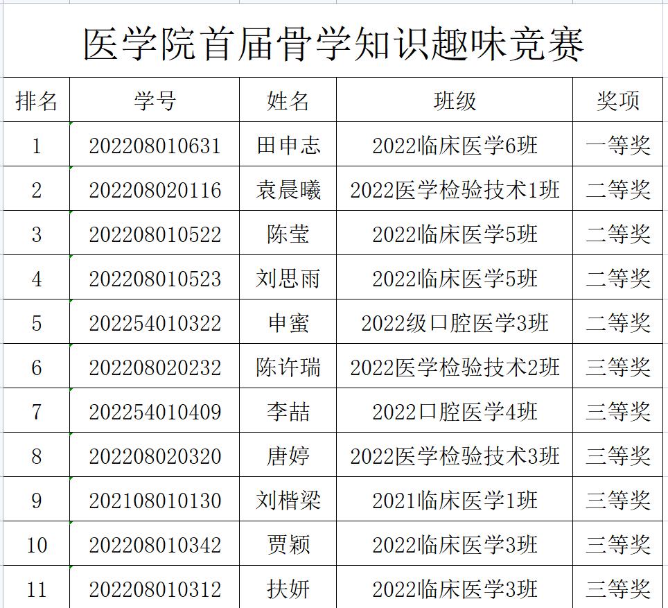 经过参赛选手三轮激烈的比拼和工作人员严谨负责的评分,最终按第二轮和第三轮的总分评选一二三等奖,三轮总分最高获最佳参赛奖,至此首届骨学知识趣味竞赛圆满结束。
