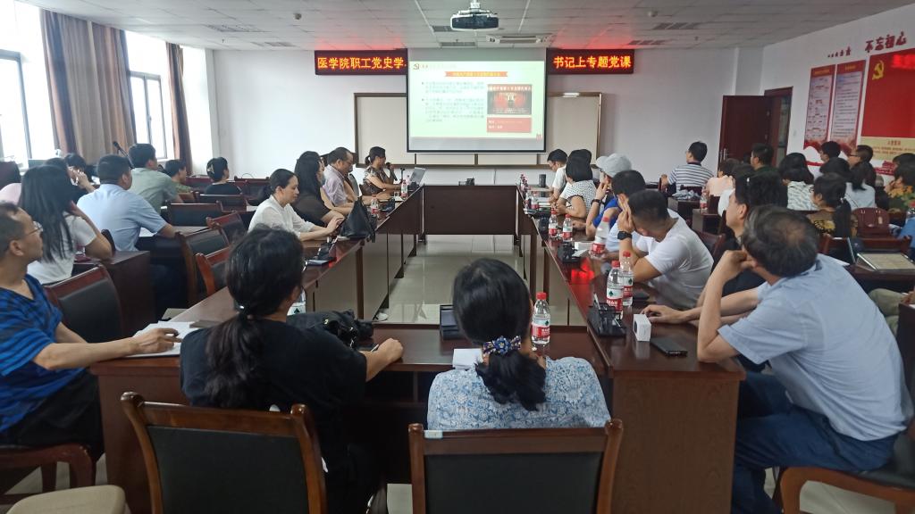 为深入开展“四史”学习教育,积极推动广大教职工在学史知史中坚守初心、践行使命,6月24日,学院党委书记文红艳在医学院会议室做了题为《铭记党史 不忘初心》党史学习教育专题党课。医学院全体教职工参加学习。