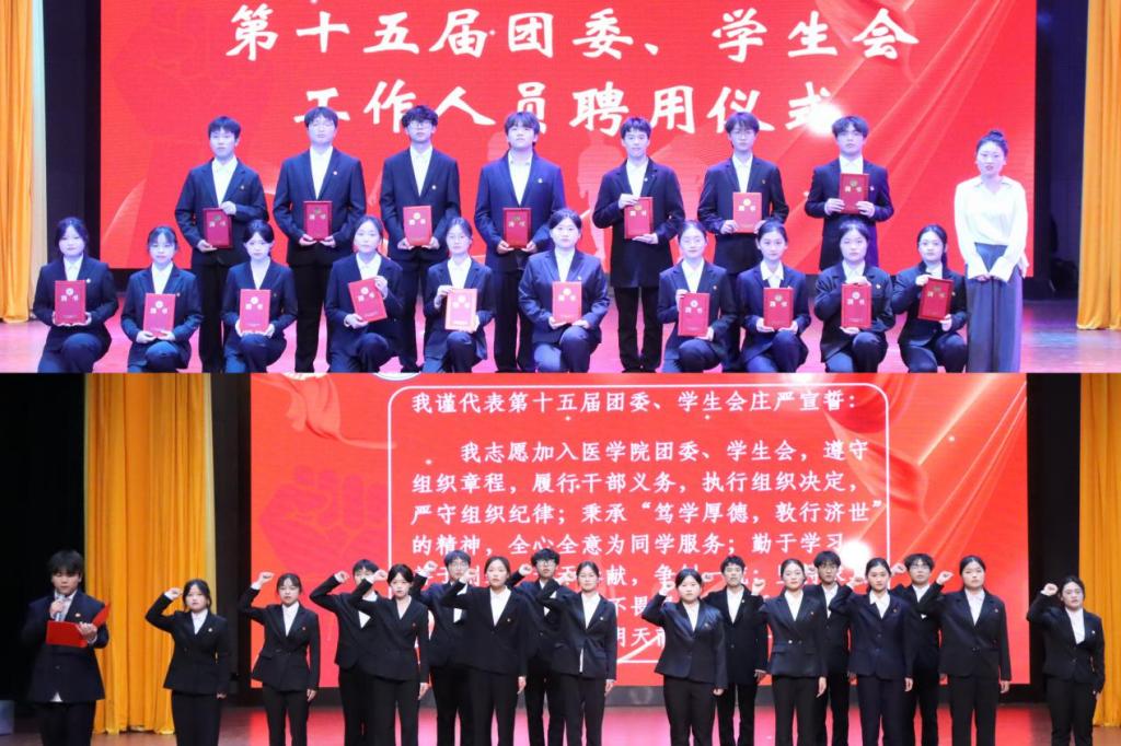 李帆影为选举通过的团委、学生会干部颁发聘用证书,第十五届团委副书记卢彦旭带领新干部们进行庄严宣誓,许下服务同学、奉献学院的坚定诺言。